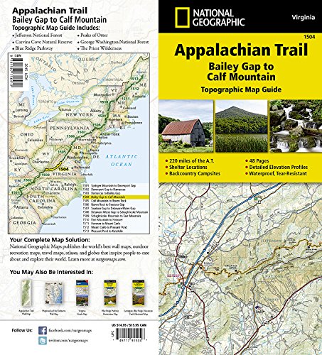 • Waterproof • Tear-Resistant • Topographic Map GuideThe Bailey Gap to Calf Mountain Topographic Map Guide makes a perfect traveling companion when traversing the central Virginia section of the Appalachian Trail (A.T.). The A.T. in central Virginia falls mostly within National Forest land, traveling through mature forests and over high mountain summits. The trail becomes more difficult as hikers go farther south, traversing the A.T.'s northernmost balds, past interesting rock formations, and over notable peaks, such as the Priest, McAfee Knob, and Dragon's Tooth.